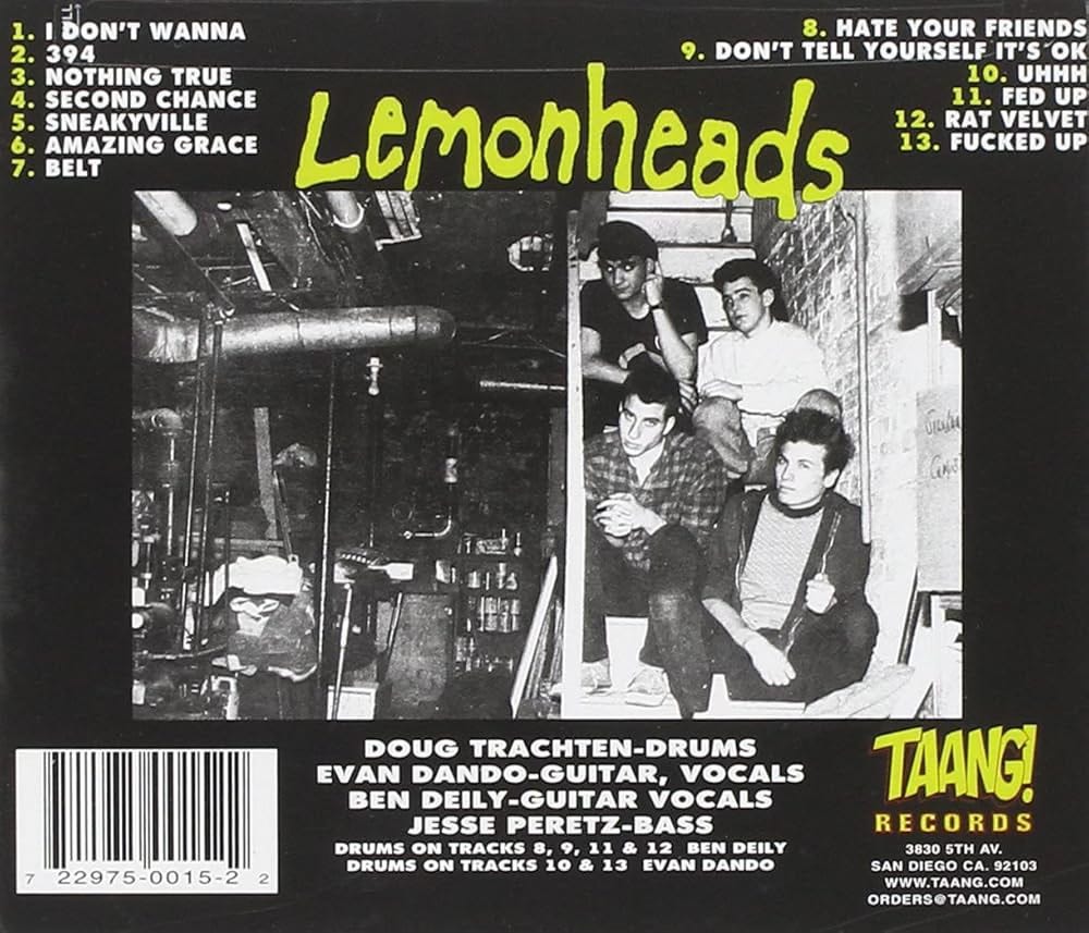 In all honesty, the early Lemonheads were kind of a joke. Evan admits as much, calling them “a ramshackle punk rock party band that no one, including ourselves, took very seriously.” But when they signed with the Boston indie label Taang! and put out their first full-length album Hate Your Friends, complete with back cover photo taken down in the basement where we all rehearsed (see below), I began detecting signs of seriousness. Ben’s “Second Chance” wasn’t just a bona fide pop song, it was a bona fide good pop song. (Then they blew my mind by making a video for it. A video that MTV actually aired!) As for the album’s prime Evan tune, “Don’t Tell Yourself,” I was stunned by its beauty—sensitive and sad but still rocking, with a heart-piercing wordless melody in the bridge. Its author says that it remains one of his own favorite compositions, an opinion apparently shared by another Bostonian of note, the Lyres’ Jeff Conolly, as well as yours truly.